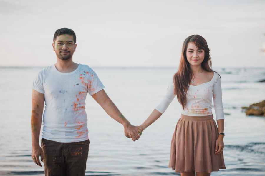 man and woman standing beside body of water