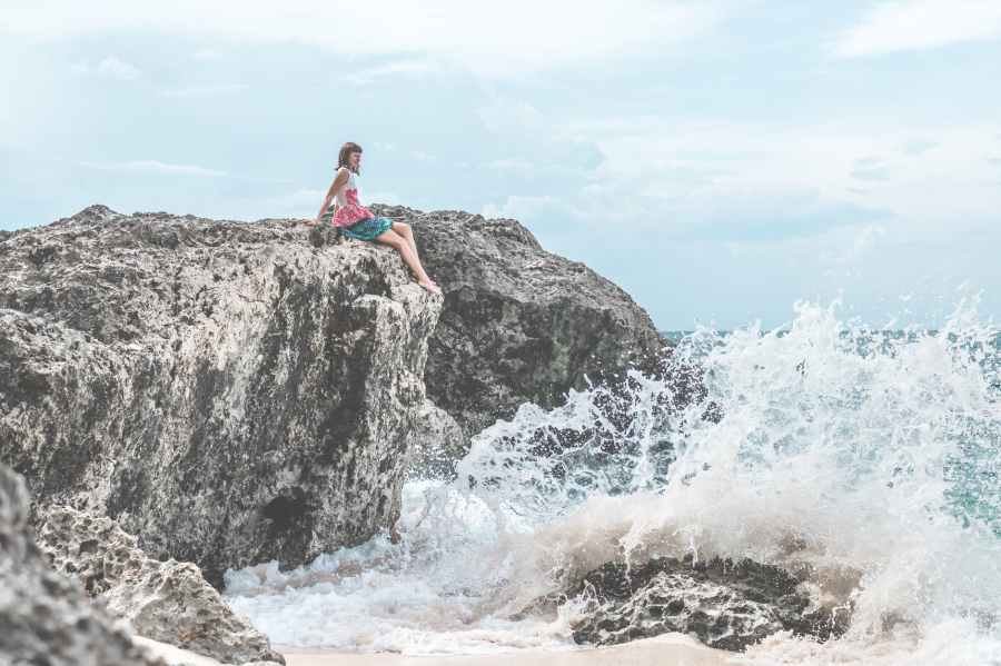 woman sitting of rock near body of water